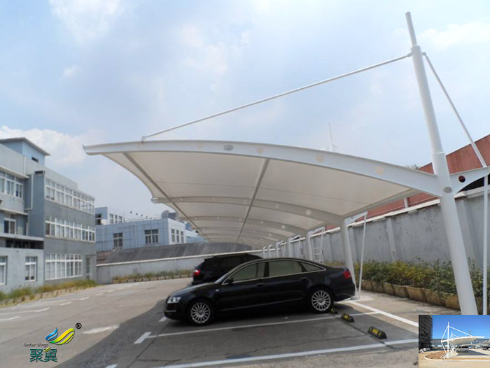 膜结构使用寿命及特点:膜结构车棚的篷布材质是膜材,而膜材的最大特点是强度高、耐久性好、防火难燃、自洁性好,不受紫外线影响,使用寿命长,一般15-30年。具有高透光率,透光率为13%,对热能反射率73%,热吸收量很少。正是因为这种划时代的膜材料的发明,使膜结构车棚成为现代化的永久建筑。