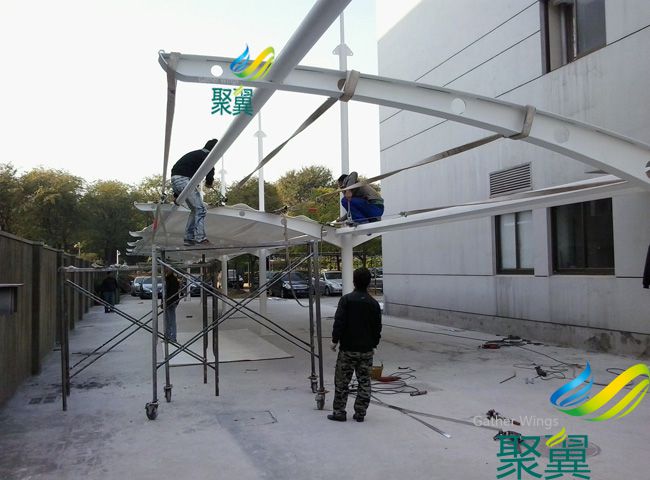详细>>JY-20双开车棚资料选用膜构造建筑材料1 透光性:透光性好,透光率20% 在阳光下暴晒不会建立黄...