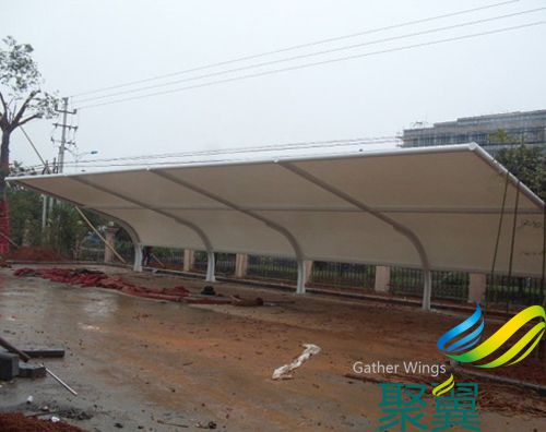弯弧膜结构车棚整体设计考虑:遮阳防雨效果实用价值性,采用流线型设计大气时尚。是一款具有现代时尚前沿结合的新式遮阳车棚,另外它具有自己独特的防雨遮阳应用面积更大于普通车棚1.2倍的效果。价格方面考虑到钢结构的整体用量与普通膜结构车棚相比,此款车棚钢结构主体采用圆管钢材大大减少了用钢量,是一款经济实用的高端车棚。 弯弧膜结构车棚整体寿命:正常使用情况下8-15年。 弯弧膜结构车棚面料选择: PVC膜材规格:门幅2.7米、3.0米、3.2米。(每卷长度为100米) 膜材厚度:650g,950g,1100g,1200g,1300g每平方。 透光率为10%-15%,对热能反射率73%。 其他进口膜材均可选择:聚翼设计部为您量身订制最佳方案!