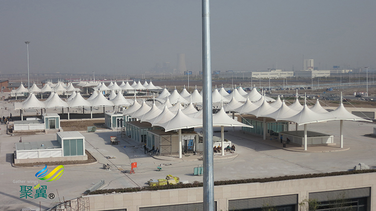 帽顶膜结构车棚、汽车棚、遮阳雨棚、停车棚款式造型可以根据停车区域设计,客户形象需求设计、合理设计、聚翼提供专业精英设计师团队为您量身定制,提供(免费)上门测量、设计出案、来图来样加工制作、施工承包 、轻包工、完善售后等服务,欢迎来电洽谈合作,预约咨询请拨打(全国统一客服热线)4008-613-119。