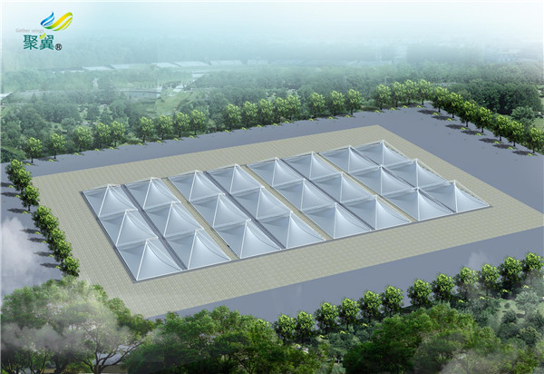 目前,污水池密封可采用:钢支撑反吊膜、无骨架密封集气罩、悬索反吊膜等不同的设计方案,每一种设计方案材料的用量都会有很大区别。一般采用钢支撑反吊膜的较多,跨度太大时可以选择无骨架密封集气罩、悬索反吊膜等解决方案。