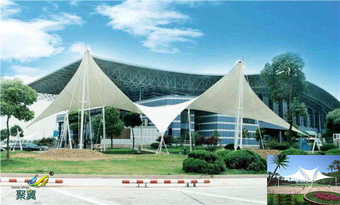 1.景观膜结构能够覆盖大跨度空间因为重量轻,膜结构中利用的薄膜材料,每平方米重量只要一公斤。加上电缆,钢结构高强度材料的采取,使膜结构跨度大空间,构成开放的无柱大跨度结构体系