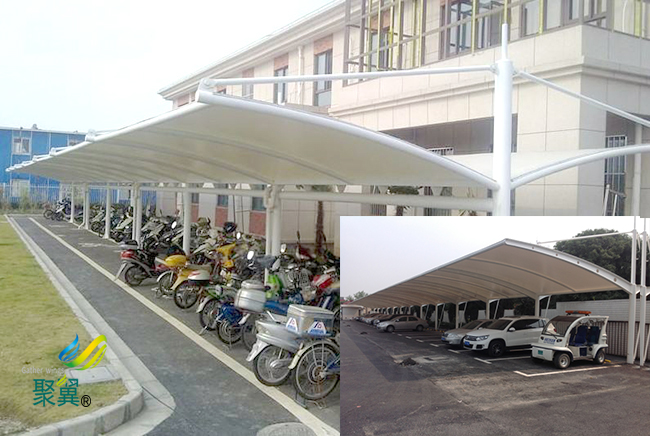 膜结构车棚的顶部采用的是膜结构优质材质,膜结构车棚透光透景、低碳节能、绿色环保、遮阳隔热、膜结构车棚抗风抗压、防火阻燃、自洁易洁、时尚美观等,所以被越来越多的人所接受。