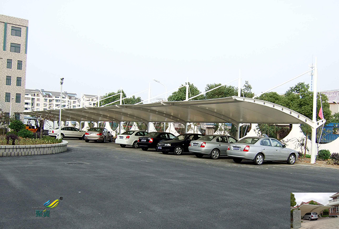 1、膜结构充电桩车棚耐用:由于高强度的出现,再加上张拉技术的应用,使