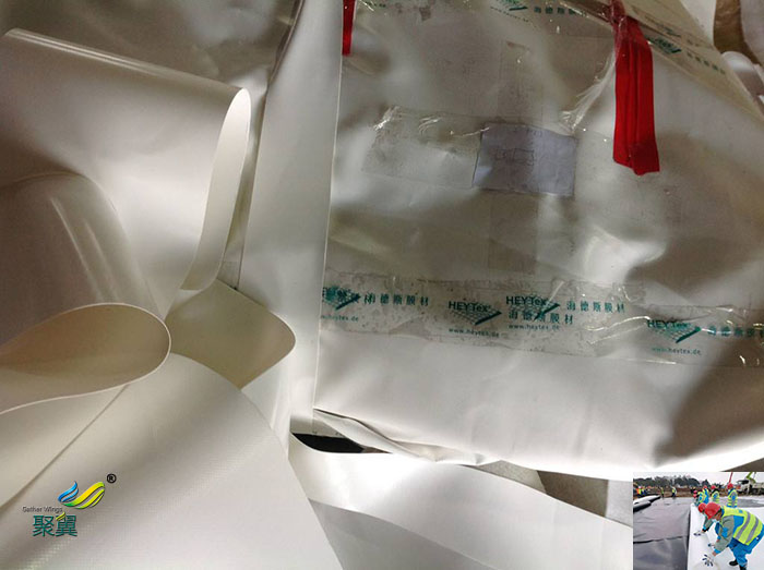 PVC膜材料膜布具有强度高、耐久性好、防火难燃、自洁性好,而且不受紫外光的影响,其使用寿命在20年以上。并且透过膜材料的光线是自然散漫光,不会产生阴影,也不会发生眩光。对太阳能的反射率高,所以热吸收量很少。即使在夏季炎热的日光的照射下室内也不会受太大影响。正是因为这种划时代性的膜材料的发明,才使膜结构建筑从人们想象中的帐篷或临时性建筑发展成现代化的永久性建。